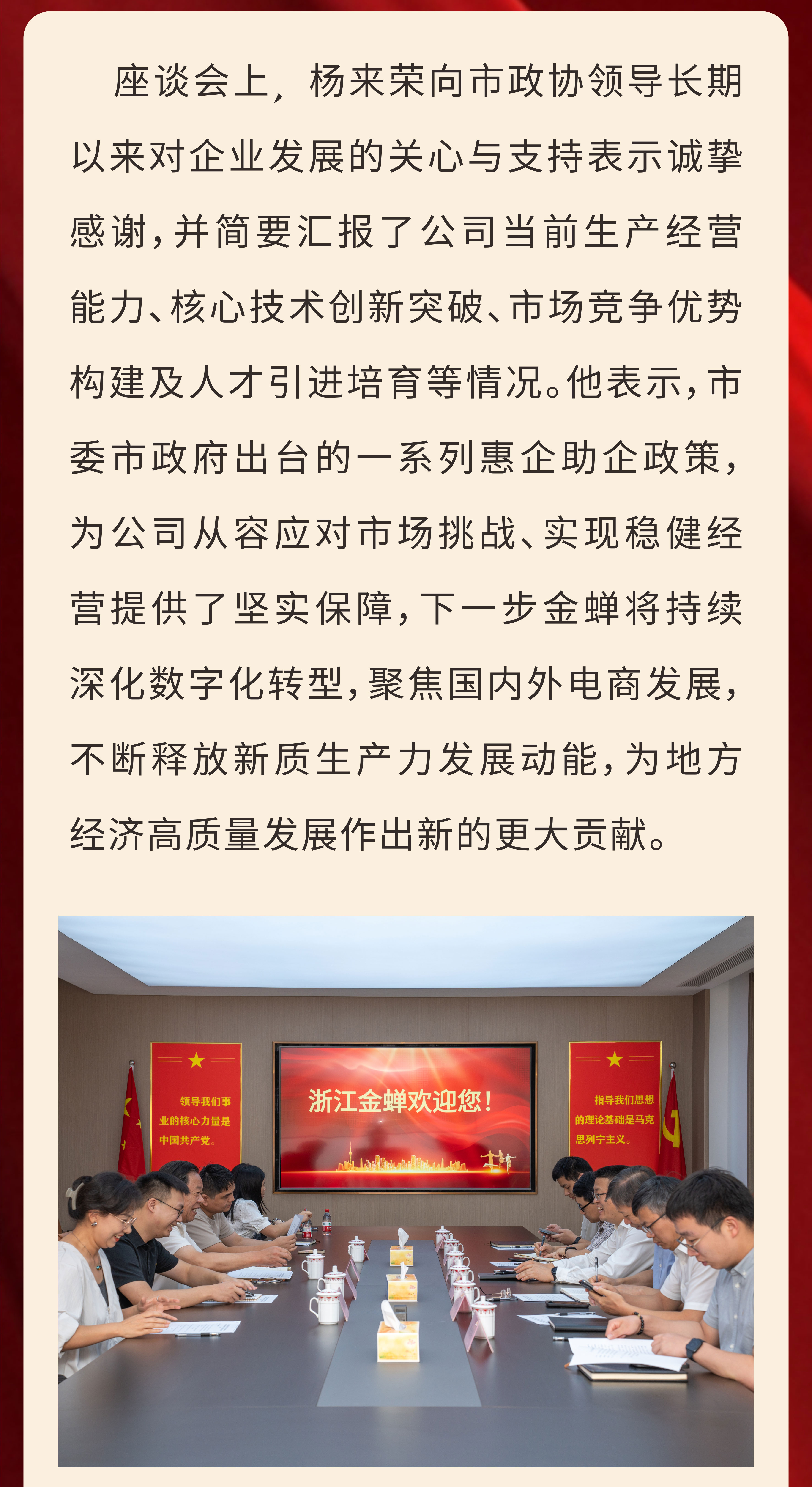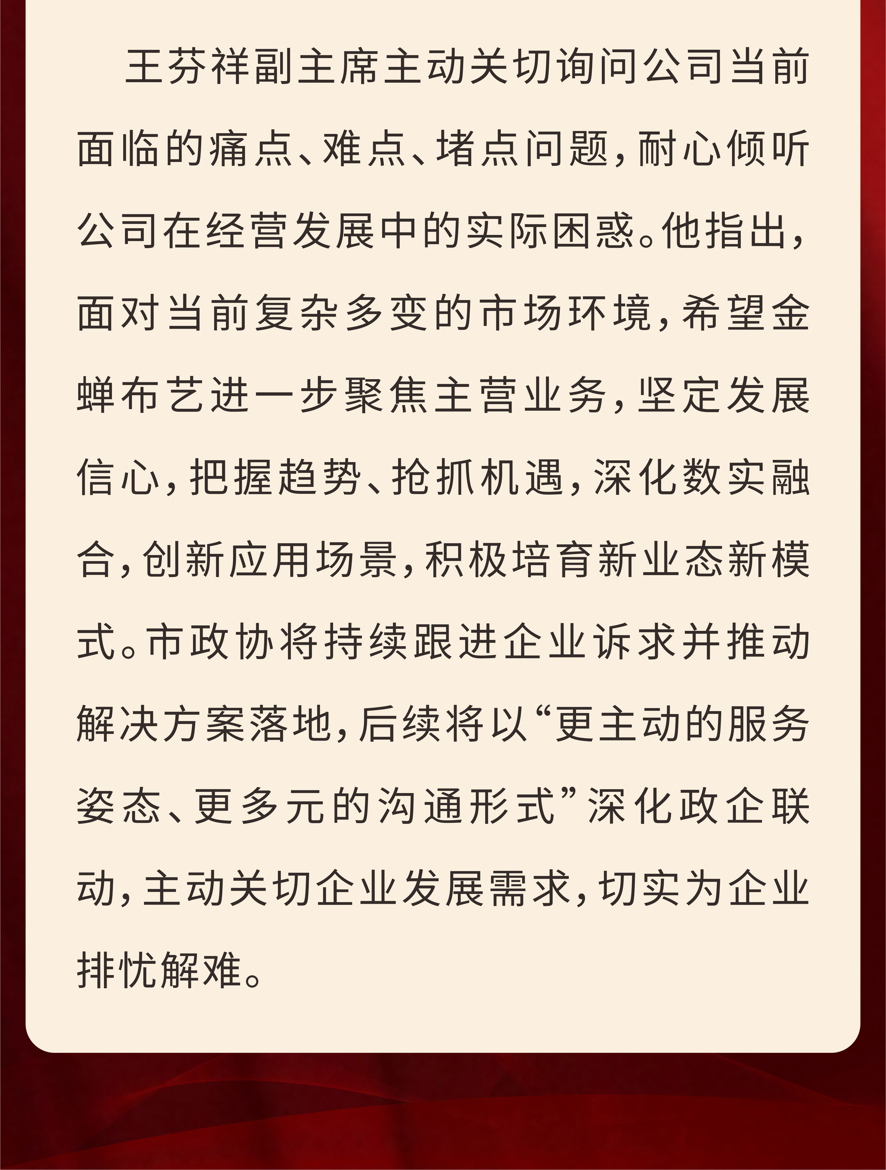 - 【JINCHAN金蟬窗簾】新春走訪暖企心 凝心聚力促發(fā)展——柯橋區(qū)統(tǒng)戰(zhàn)部領導、柯橋區(qū)商務局領導走訪慰問金蟬布藝 2025-02-08