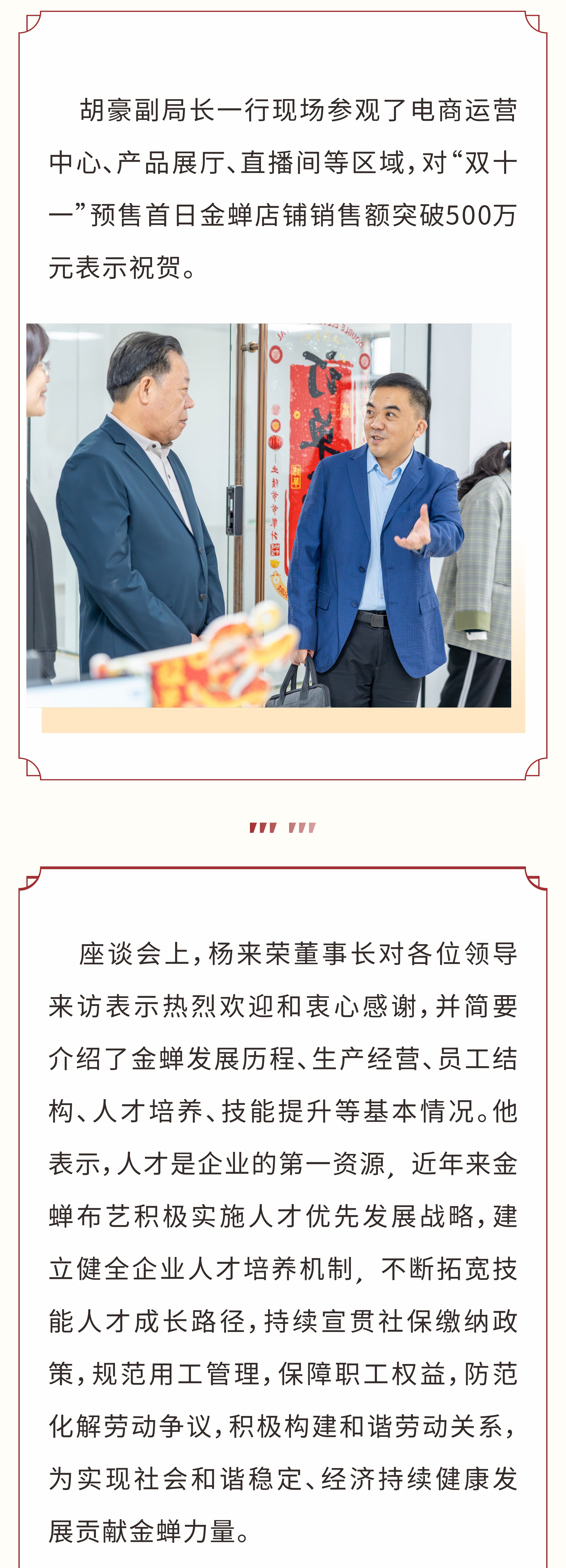 - 【JINCHAN金蟬窗簾】紹興市人力社保局黨組成員、副局長(zhǎng)胡豪一行蒞臨金蟬布藝調(diào)研指導(dǎo) 2025-10-22